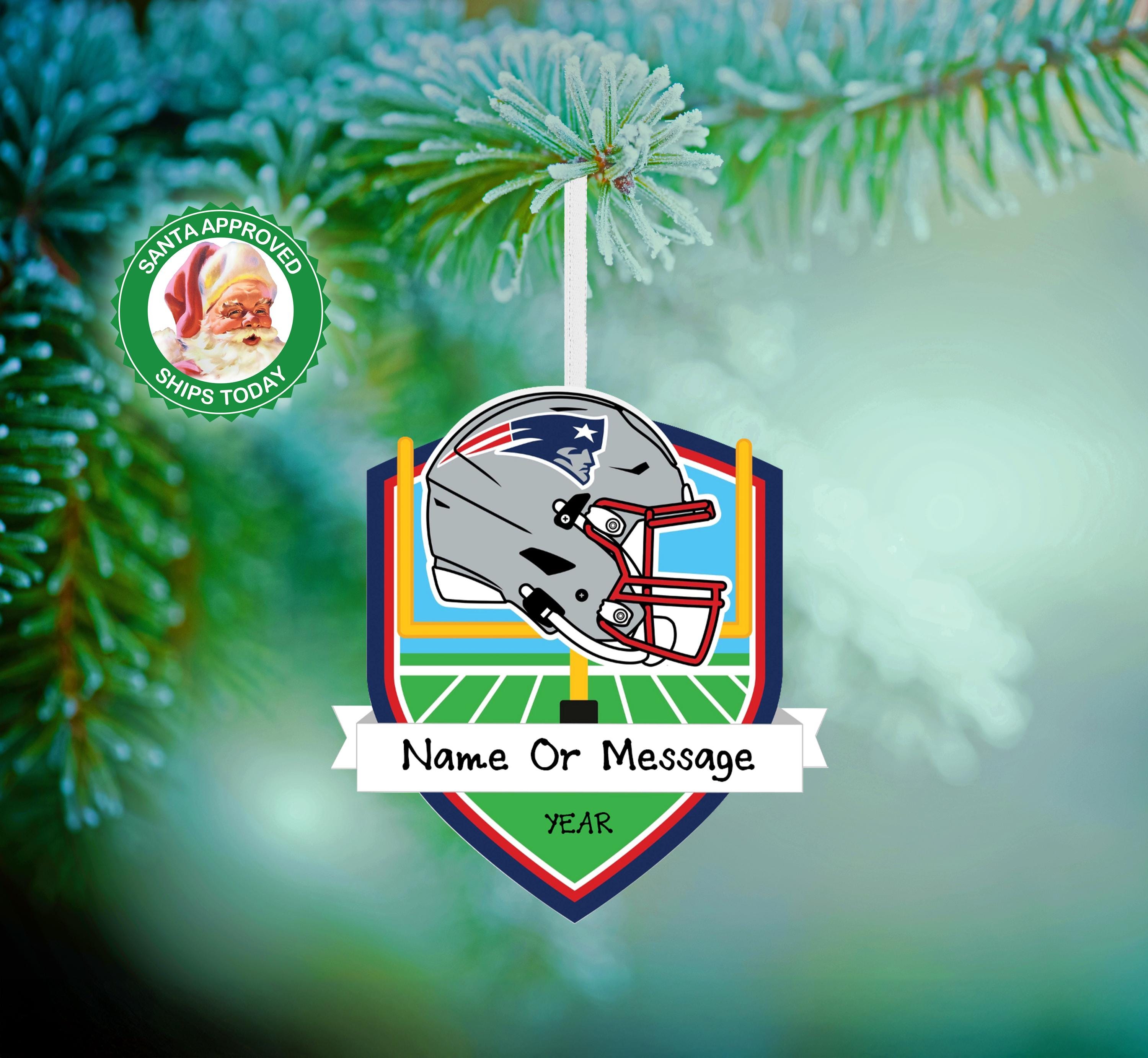 Celebrate your team spirit this holiday season with our New England Patriots Personalized Christmas Ornament! Officially licensed NFL design, this ornament makes the perfect keepsake for Patriots fans of all ages. Add a name or year to create a one-of-a-kind gift that will be treasured for years to come.