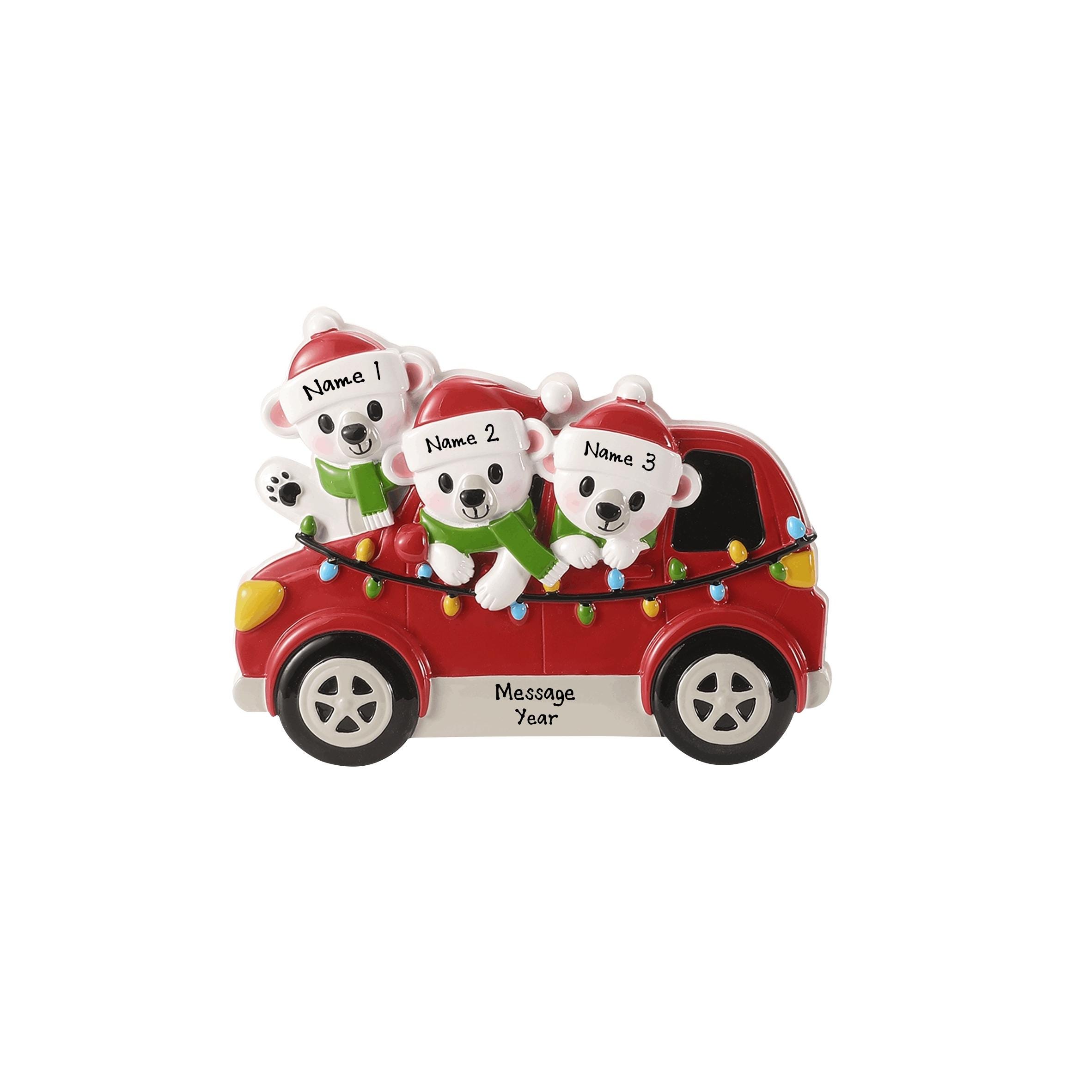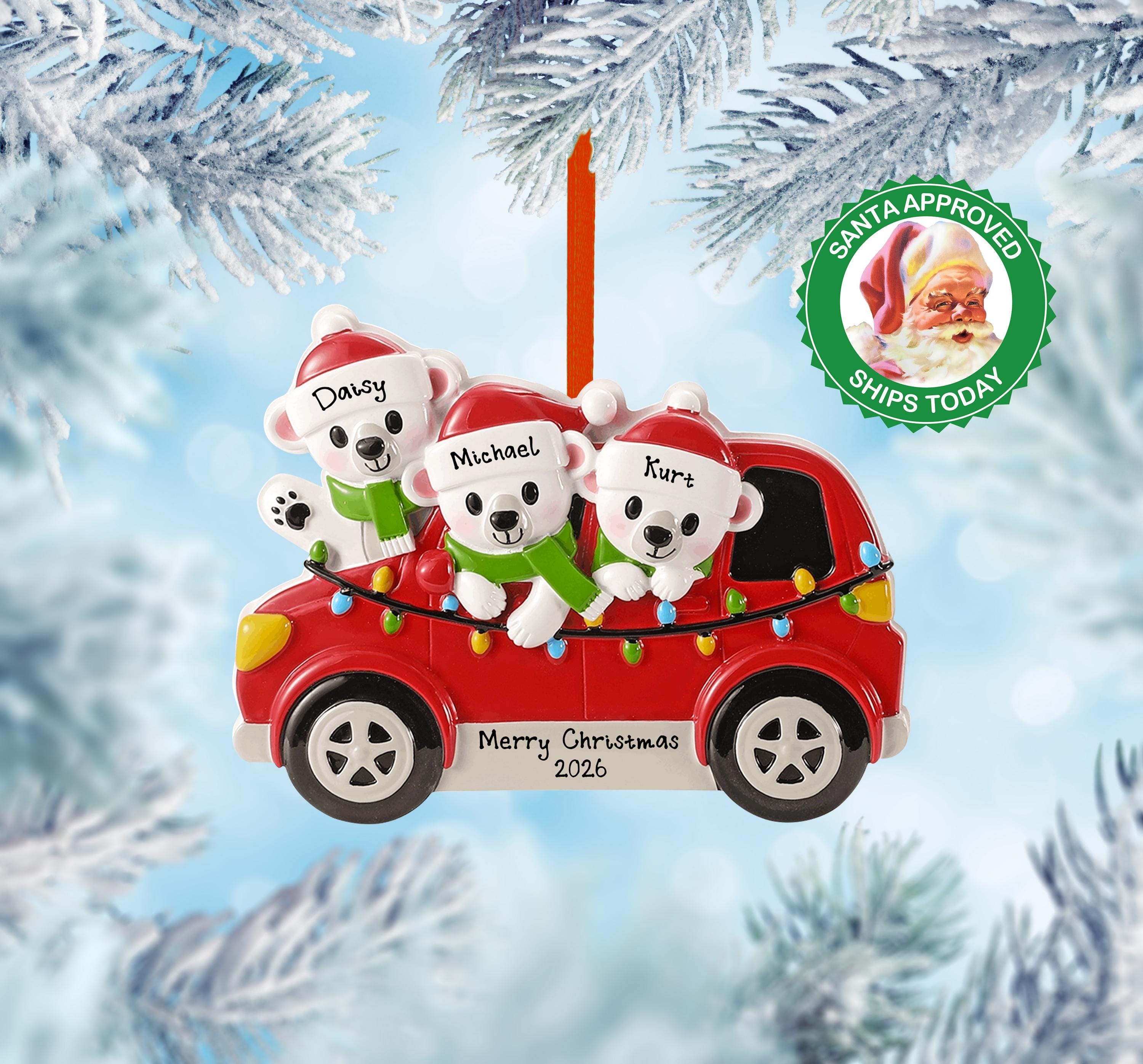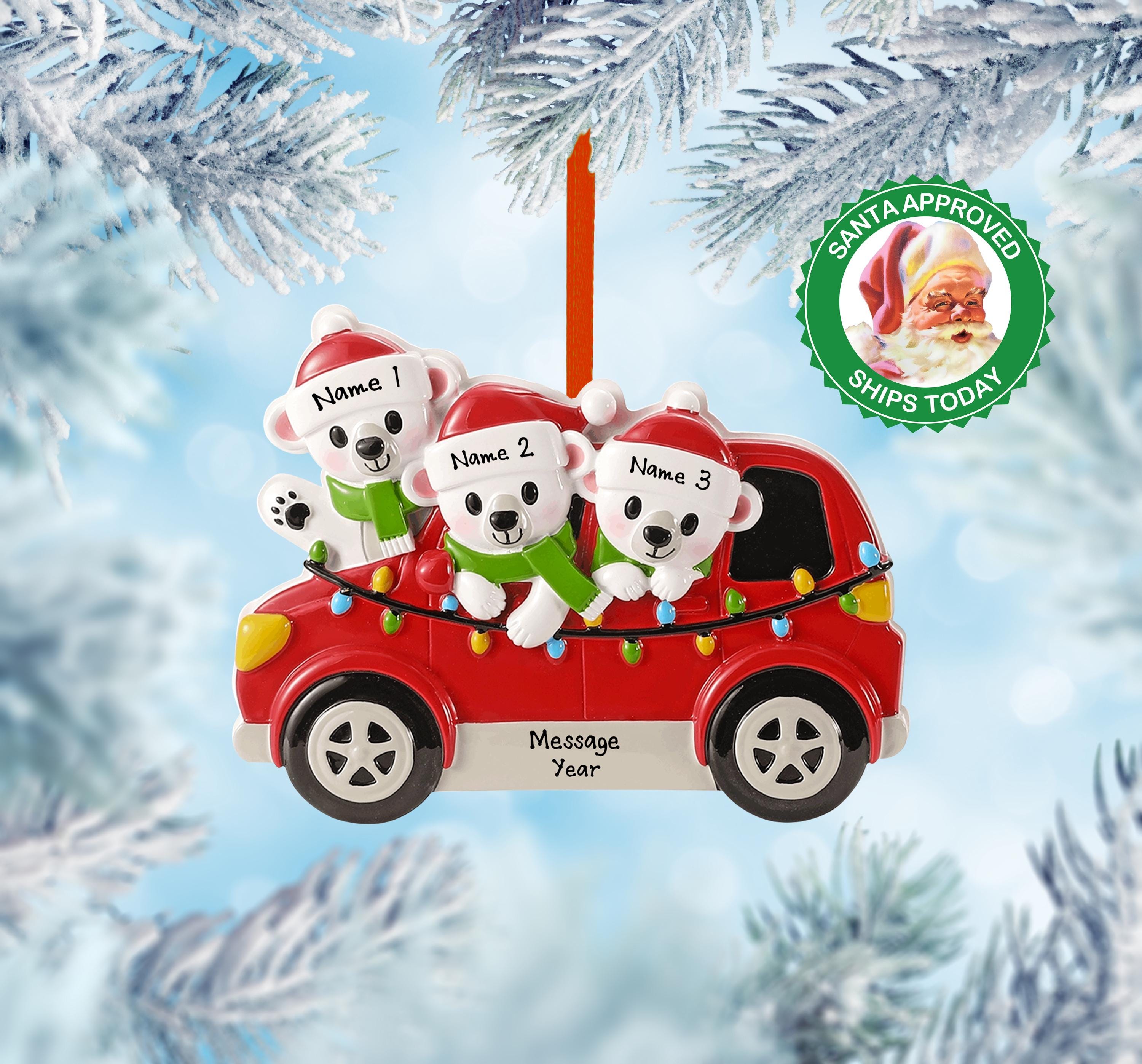 Celebrate the season with this Personalized Polar Bear Family of 3 Ornament! Featuring a cozy red truck design with holiday lights and space for family names, it makes a treasured Christmas Ornament and lasting Holiday Gift. Perfect as a Custom Ornament, it works beautifully as a Family Ornament, a festive Holiday Decoration, or a thoughtful gift for loved ones. Use it as a Stocking Stuffer or a Family Keepsake to create lasting holiday memories.