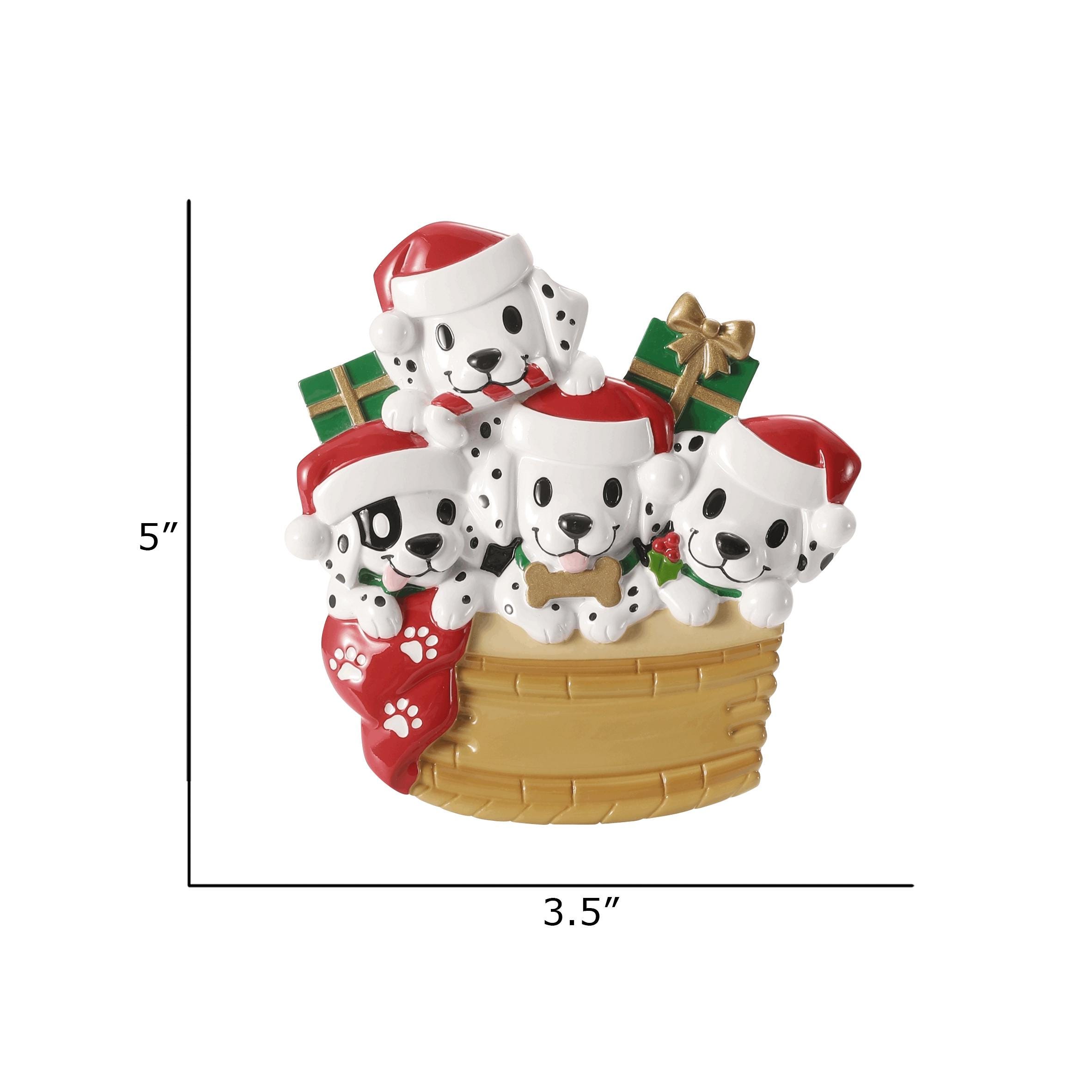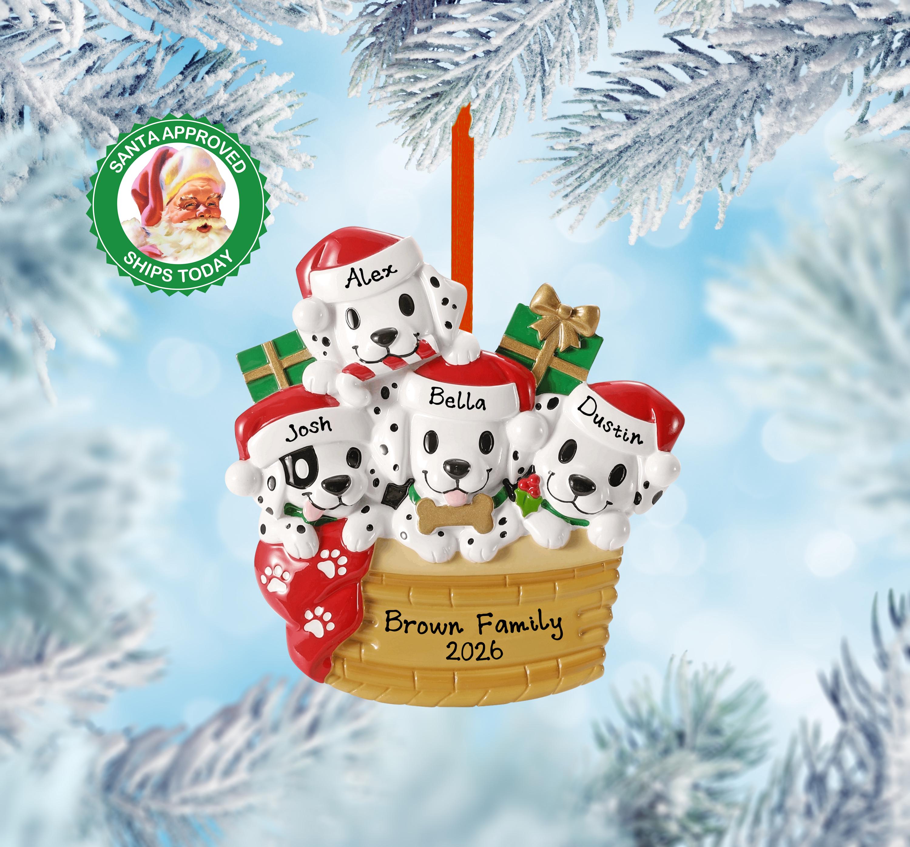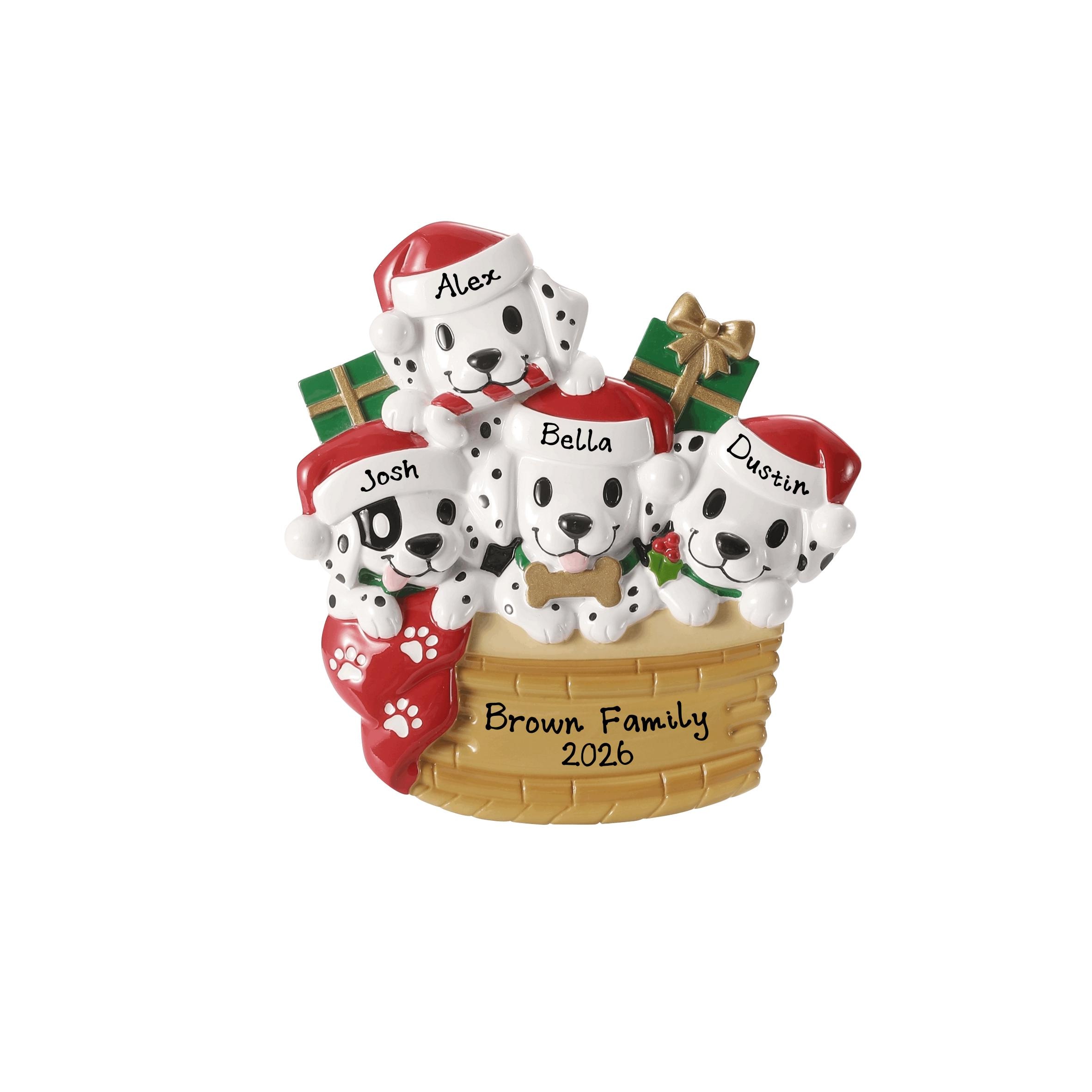 Celebrate the season with this Personalized Dalmatian Puppy Family of 4 Ornament! Featuring four adorable Dalmatian puppies with space for family names, it makes a treasured Christmas Ornament and lasting Pet Keepsake Gift. Perfect as a Custom Ornament, it works beautifully as a Family Ornament, a festive Holiday Decoration, or a thoughtful gift for dog-loving families. Use it as a Stocking Stuffer or a Family Keepsake to create lasting holiday memories.